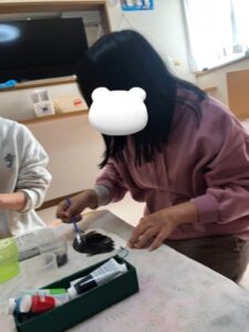 個人では一人ひとつ、クリスマスバックの色塗りを行いました。