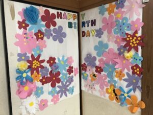 先月卒業のために作成したお花の壁面は、お誕生日ブースに変身しました✨