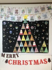 三角形をツリーにみたてて飾りつけをしたり、サンタやトナカイを作ったりしました。