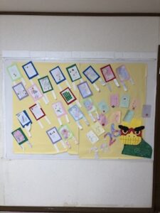 画用紙を切って中には自分の好きな絵を描いたり、シールを貼ったり、マーブリングをしました。